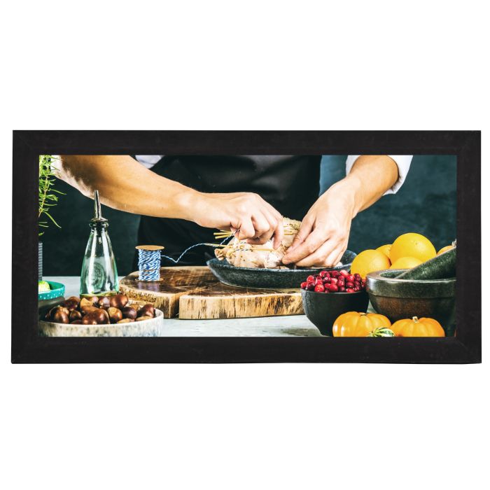 Gode di un profilo con angolo interno a 45° studiato per videoproiettori ad ottica ultra corta. Questa ergonomicità garantisce inoltre una perfetta planarità della tela installata sul retro della cornice.