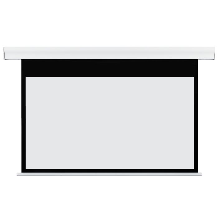 Questo pannello elettrico per proiezione monta un motore della Somfy che assicura precisione e silenziosità, può essere comandato dall'interruttore da parete fornito di serie oppure dal radiocomando opzionale. Il motore è montato a destra del cassonetto, dove la tela per proiezione si avvolge.