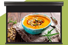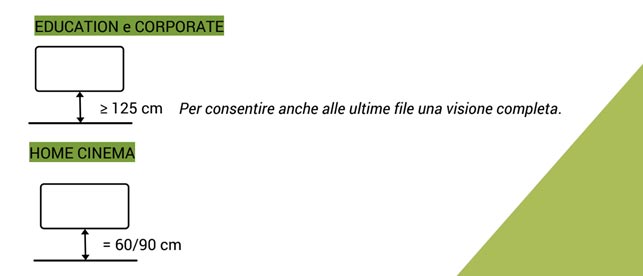 Diverse sono le ipotesi per determinare le misure del telo da acquistare: il nostro consiglio è di selezionare uno schermo con una base larga circa 1,5 – 2 volte la distanza di visione. L’altezza del soffitto della stanza gioca un ruolo molto importante quando si sceglie una corretta posizione per il vostro proiettore. Infatti, il bordo inferiore dello schermo aperto dovrebbe essere distante tra i 60/120 cm dal pavimento. Un’immagine troppo alta o troppo bassa potrebbe finire per affaticare gli occhi ed il collo creando una situazione di stress.