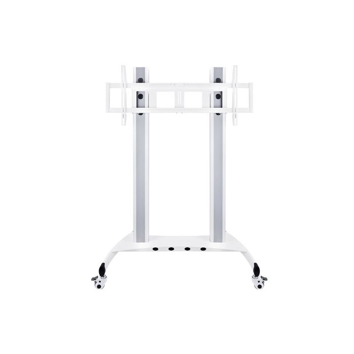 Altezza pari a 180 centimetri, carico massimo pari a 90 chilogrammi, progettato per ospitare schermi piatti da 60 a 90 pollici, con rotelle bloccabili e ampia base. Colore bianco. Prodotto su ordinazione.